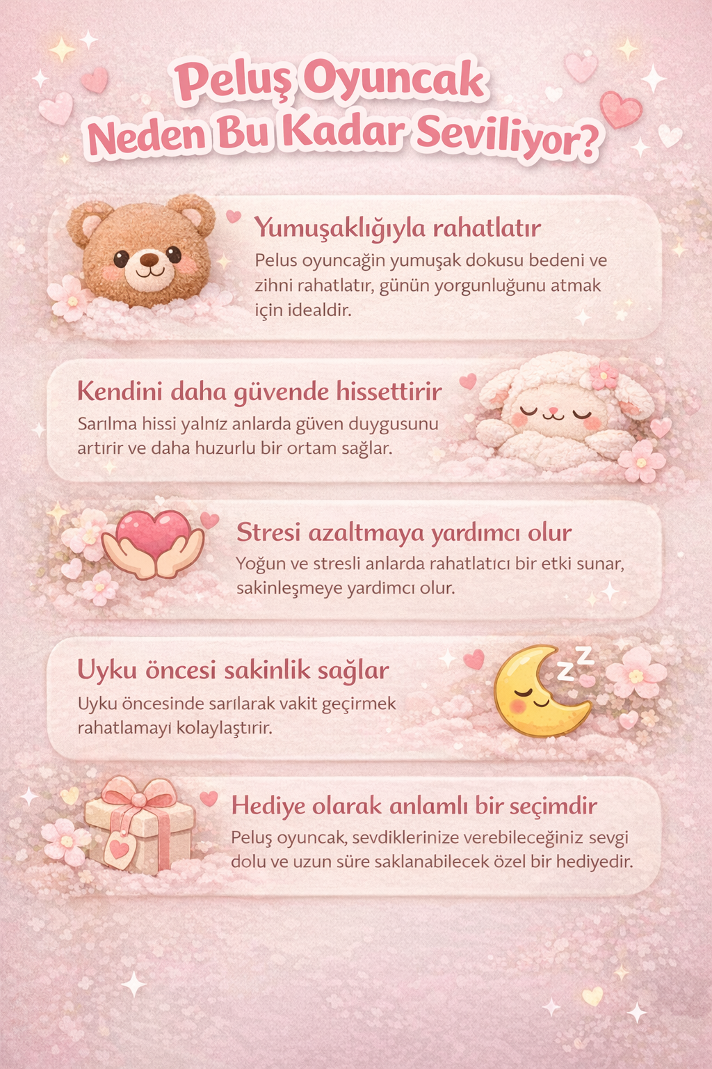 Her detayında yumuşaklık hissi veren bu peluş, sarıldıkça rahatlatan bir etki sunar.